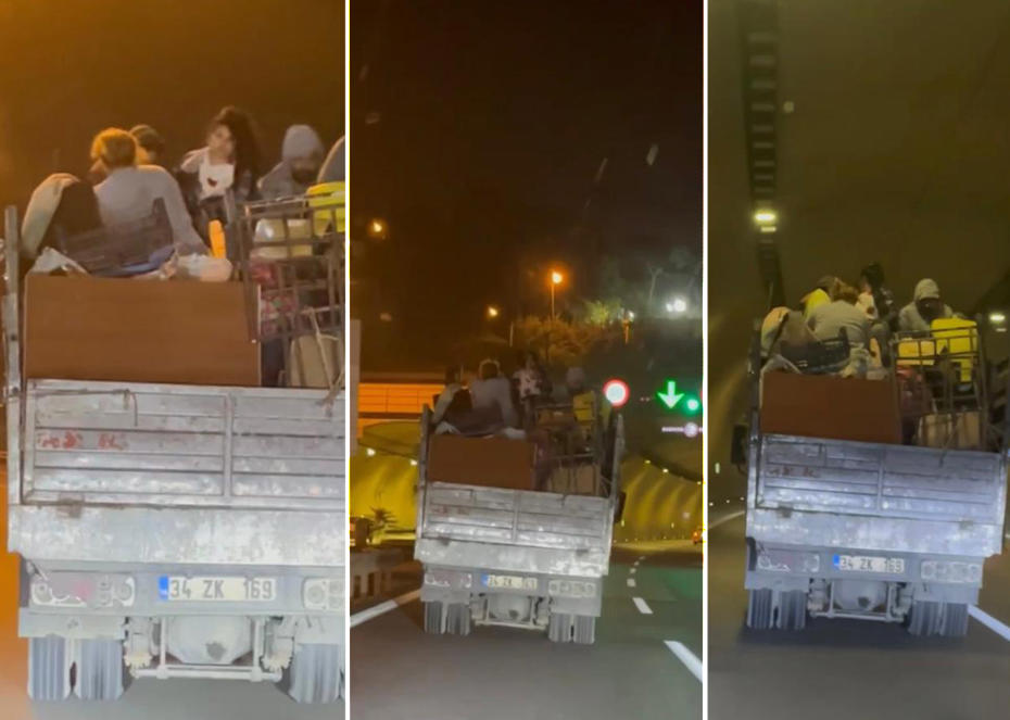 Seyir halindeki kamyonette, eşyaların üzerinde oturan iki çocuk dahil olmak üzere, yolcuların güvenlik önlemi almadan seyahat ettiği görüntüler sosyal medyada büyük yankı uyandırdı.